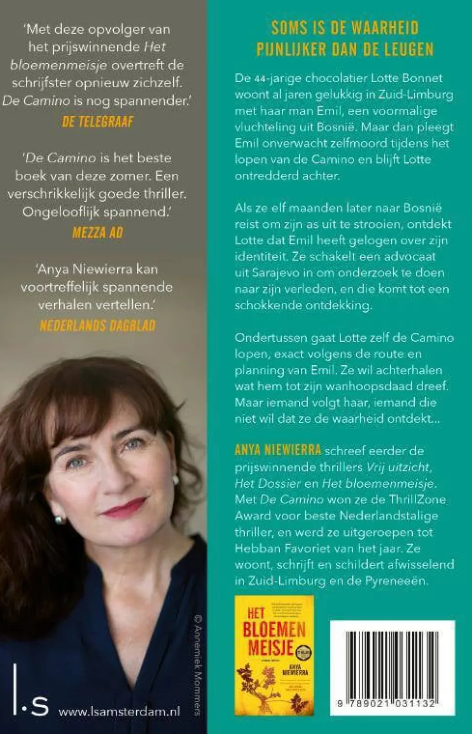 De 44-Jarige Chocolatier Lotte Bonnet Woont Al Jaren Gelukkig In Zuid-Limburg Met Haar Man Emil, Een Voormalige Vluchteling Uit Bosnie. Maar Dan Pleegt Emil Onverwacht Zelfmoord Tijdens Het Lopen Van De Camino En Blijft Lotte Ontredderd Achter.Als Ze Elf Maanden Later Naar Bosnie Reist Om Zijn As Uit Te Strooien, Ontdekt Lotte Dat Emil Heeft Gelogen Over Zijn Identiteit. Ze Schakelt Een Advocaat Uit Sarajevo In Om Onderzoek Te Doen Naar Zijn Verleden, En Die Komt Tot Een Schokkende Ontdekking. Ondertussen Gaat Lotte Zelf De Camino Lopen, Exact Volgens De Route En Planning Van Emil. Ze Wil Achterhalen Wat Hem Tot Zijn Wanhoopsdaad Dreef. Maar Iemand Volgt Haar, Iemand Die Niet Wil Dat Ze De Waarheid Ontdekt.Niewierra Won Met De Camino De Thrillzone Award (Thriller Van Het Jaar) En Het Werd Ook Uitgeroepen Tot Hebban Favoriet 2021.