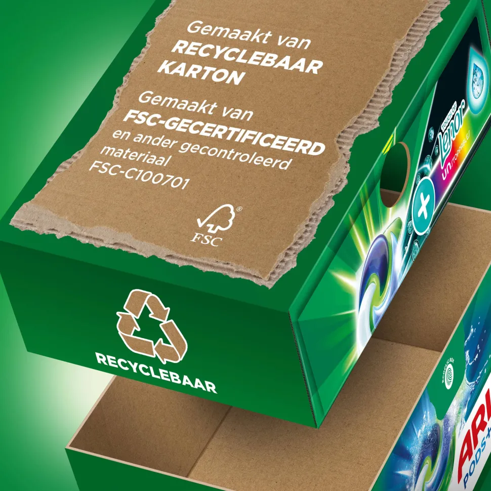 • Ecoclic Kartonnen Doos: Zorg Voor Minder Plastic Met Ariel All-In-1 Pods-Wastabletten, Nu In Een Recyclebare Kartonnen Doos Die Gemaakt Is Met 70% Gerecyclede Vezels En Maximaal 5% Plastic, Ontworpen Om Je Pods Te Beschermen
