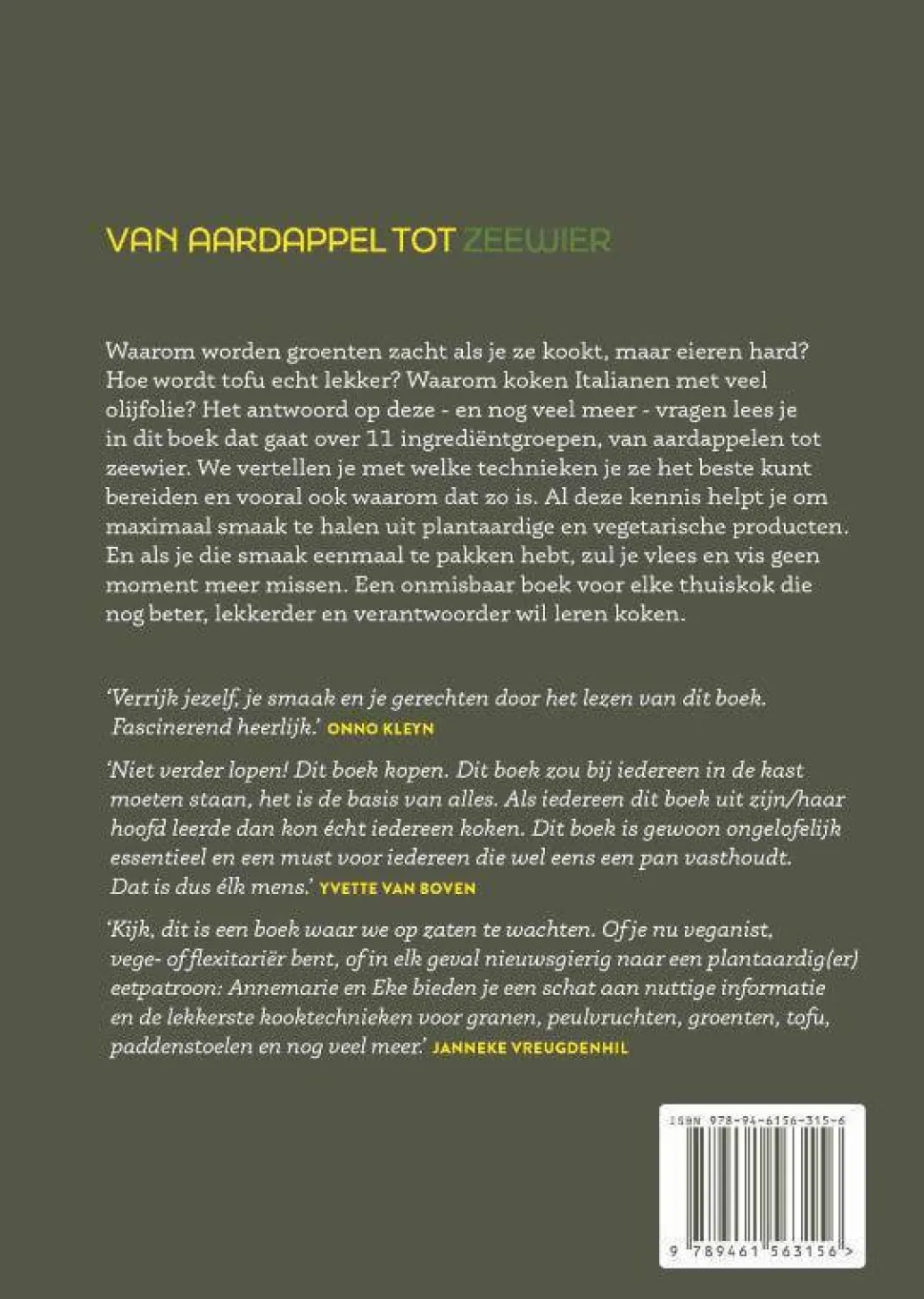 Waarom Worden Groenten Zacht Als Je Ze Kookt, Maar Eieren Hard? Hoe Wordt Tofu Echt Lekker? Waarom Koken Italianen Met Veel Olijfolie? Het Antwoord Op Deze – En Nog Veel Meer – Vragen Lees Je In Dit Boek Dat Gaat Over 11 Ingredientgroepen, Van Aardappelen Tot Zeewier. We Vertellen Je Met Welke Technieken Je Ze Het Beste Kunt Bereiden En Vooral Ook Waarom Dat Zo Is. Al Deze Kennis Helpt Je Om Maximaal Smaak Te Halen Uit Plantaardige En Vegetarische Producten. En Als Je Die Smaak Eenmaal Te Pakken Hebt, Zul Je Vlees En Vis Geen Moment Meer Missen. Een Onmisbaar Boek Voor Elke Thuiskok Die Nog Beter, Lekkerder En Verantwoorder Wil Leren Koken. ‘Verrijk Jezelf, Je Smaak En Je Gerechten Door Het Lezen Van Dit Boek. Fascinerend Heerlijk.’ Onno Kleyn’Niet Verder Lopen! Dit Boek Kopen. Dit Boek Zou Bij Iedereen In De Kast Moeten Staan, Het Is De Basis Van Alles. Als Iedereen Dit Boek Uit Zijn/Haar Hoofd Leerde Dan Kon Echt Iedereen Koken. Dit Boek Is Gewoon Ongelofelijk Essentieel En Een Must Voor Iedereen Die Wel Eens Een Pan Vasthoudt. Dat Is Dus Elk Mens.’ Yvette Van Boven’Kijk, Dit Is Een Boek Waar We Op Zaten Te Wachten. Of Je Nu Veganist, Vege- Of Flexitarier Bent, Of In Elk Geval Nieuwsgierig Naar Een Plantaardig(Er) Eetpatroon: Annemarie En Eke Bieden Je Een Schat Aan Nuttige Informatie En De Lekkerste Kooktechnieken Voor Granen, Peulvruchten, Groenten, Tofu., Paddenstoelen En Nog Veel Meer.’ Janneke Vreugdenhil