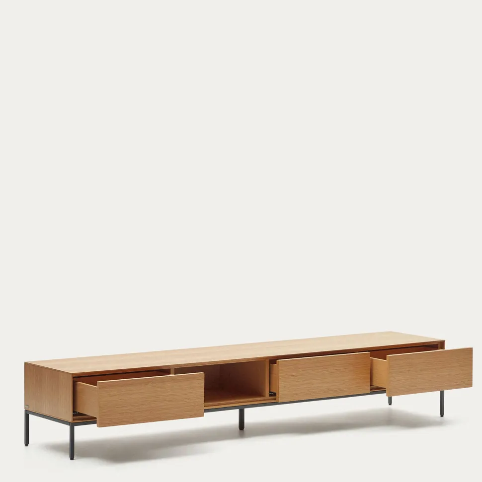 Tv-Meubel Gemaakt Van Eikenfineer. 3 Laden Met Verborgen, Verstelbare Geleiders En Push-To-Open Mechanisme. Verstelbare Stalen Poten Met Een Matte Antraciet Gelakte Afwerking. Kave Cares Design: Gemaakt Van E0 Gefabriceerd Hout Met Lage Formaldehyde Uitstoot, Om De Planeet Schoner Te Maken Van Schadelijke Stoffen. Exclusief Ontwerp, Gemaakt Door Het Kave Home Team.