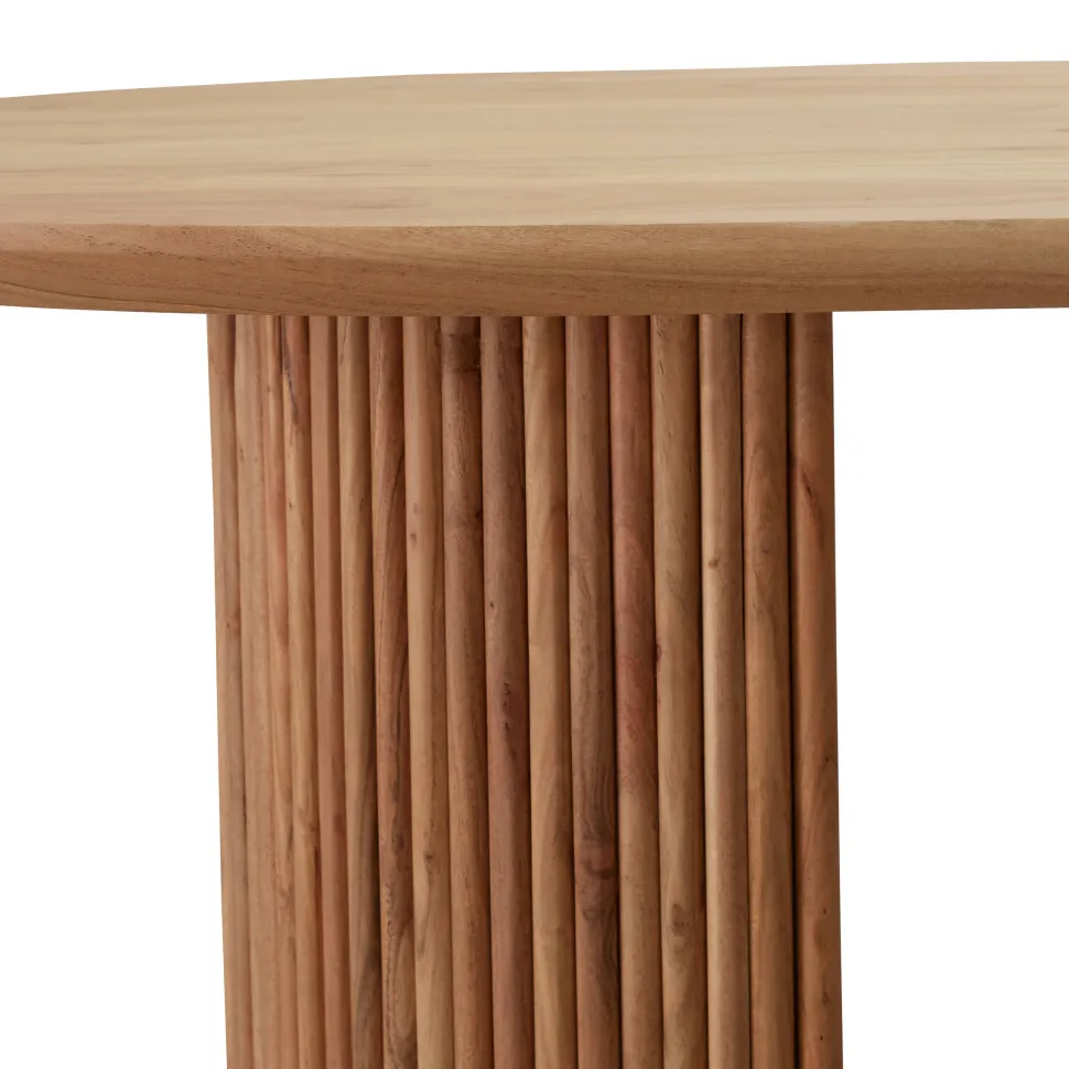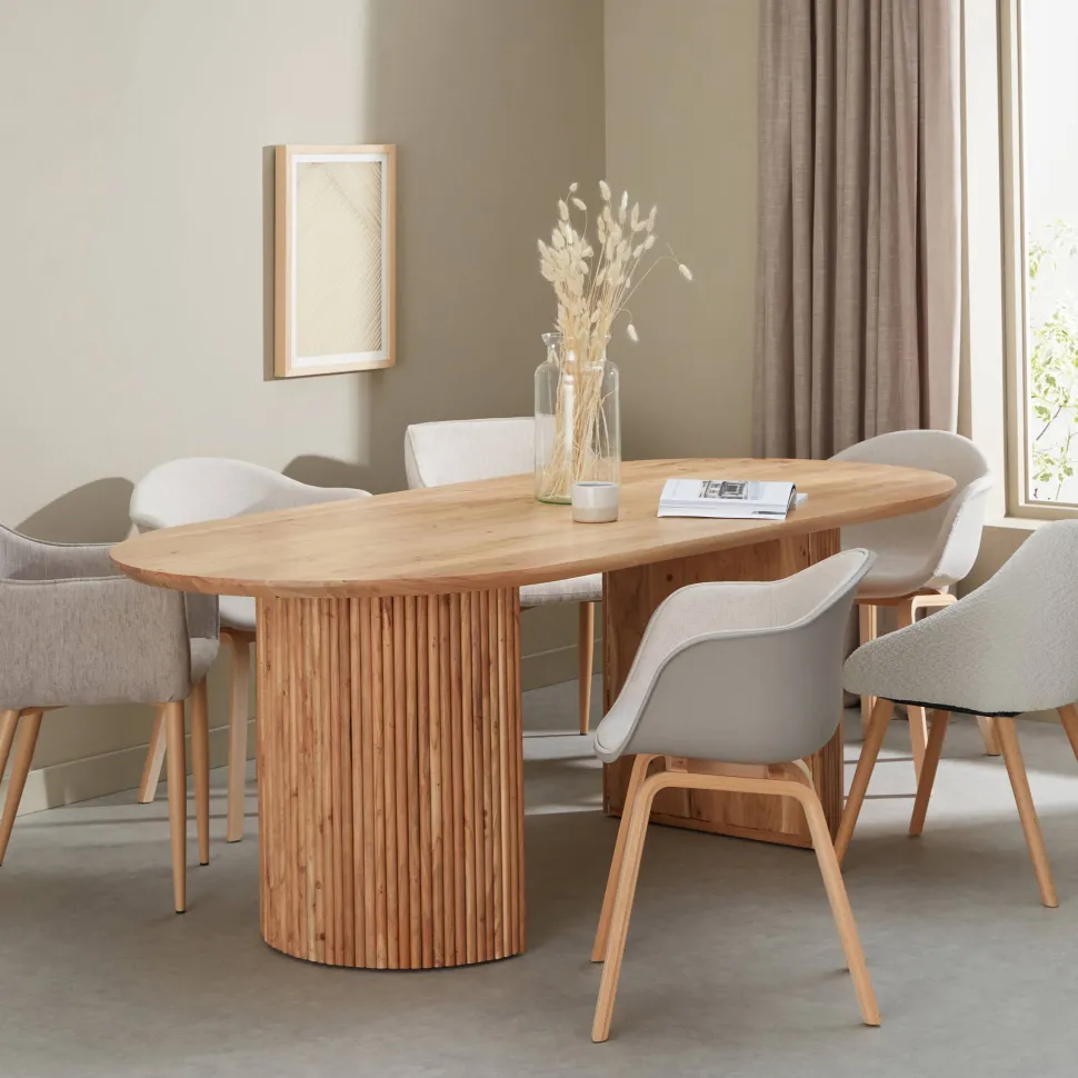 Onze Bekende Ronde Jaime Eetkamertafel Heeft Een Nieuwe Toevoeging! Ontdek De Jaime Tafel In Ovaal! Deze Robuuste Tafel Biedt Ruimte Voor Maar Liefst 6 Tot 8 Personen. Genoeg Ruimte Dus Voor Familie Diners Of Spelletjes Avonden Met Vrienden. Uniek Aan De Jaime Zijn De Bijzondere Poten. In Tegenstelling Tot De Ronde Variant, Heeft De Ovalen Tafel Twee Half Ronde Poten. Deze Poten Zijn Bekleed Met Een Bijzonder Latten Structuur. De Tafel Is Luxueus, Stijlvol En Nodigt Je Uit Om Heerlijk Te Tafelen In De Eethoek! De Tafel Van Nous Living Is Eenvoudig Te Combineren Met Andere Interieurstijlen. Naast De Getoonde Versie Is De Jaime Ook Verkrijgbaar In De Kleuren Walnoot En Zwart.