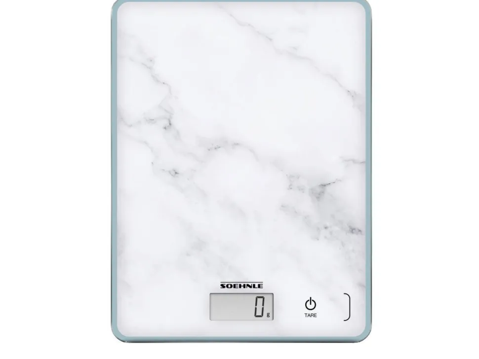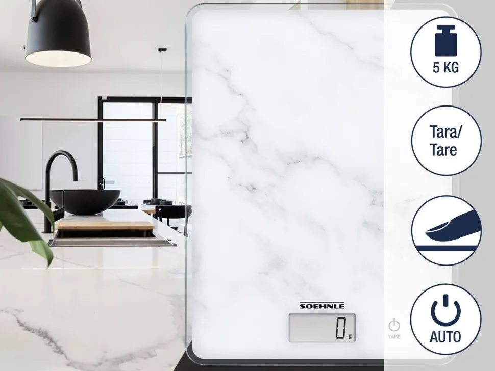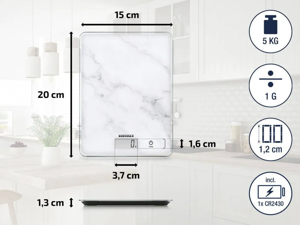 Met Een Hoge Draagkracht Van 5 Kg En Schaalverdeling Tot Op 1 Gram Nauwkeurig Is Digitale Keukenweegschaal Page Compact 300 Marble Van Soehnle Ideaal Voor Algemeen Dagelijks Gebruik. En Dankzij Het Moderne Design Is Deze Weegschaal Ook Een Waar Sieraad In De Keuken. Natuurlijke Marmerlook Voor Een Stijlvolle Uitstraling. Dankzij Het Fraaie Uiterlijk Kun Je Deze Elektrische Weegschaal Gerust Ergens In Het Zicht Zetten Of Ophangen – Dit Design Past Mooi Bij Elke Keuken. Bijzonder Praktisch Is De 12 Mm Grote Lcd-Display, Waarop Je De Cijfers Goed Af Kunt Lezen. Deze Weegschaal Met Gepatenteerd Soehnle Sensor-Touch Is Comfortabel Te Bedienen. Dit Model Heeft Geen Knoppen Of Toetsen, En Dus Ook Geen Gleufjes Waar Vuil In Vast Kan Gaan Zitten. En De Weegschaal Is Heel Gemakkelijk Schoon Te Maken. Natuurlijk Gaat Deze Bijzonder Energiebesparende Weegschaal Automatisch Uit. Met Bijweegfunctie (Tarra) Voor Handig In Dezelfde Kom Toevoegen En Wegen Van Ingredienten Bij Bakken En Koken. De Page Compact 300 Marble Heeft Antislipvoetjes, Zodat Deze Digitale Keukenweegschaal Veilig En Stevig Blijft Staan Als Je Ermee Werkt. Extraplat Compact Design Voor Plaatsbesparend Opbergen. Met Ophanggat, Dus Je Kunt De Weegschaal Ook Heel Gemakkelijk Ophangen. Batterijen Worden Meegeleverd, Zodat Je Meteen Aan De Slag Kunt Met Deze Digitale Weegschaal. De Batterijen Gaan Minstens Twee Jaar Mee, Bij Een Gebruik Van Twee Keer Wegen Per Dag. Het Batterijvak Wordt Vastgeschroefd En Is Dus Kindveilig.