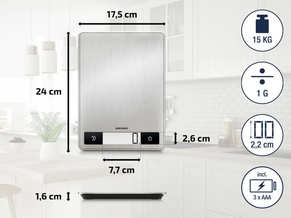 Met Deze Keukenweegschaal Is Het Al Genieten Tijdens Het Koken! Met De Page Profi 200 Van Soehnle Breng Je Een Stijlvolle Design Look In Je Keuken. Deze Keukenweegschaal Heeft Een Extra-Dun Weegplateau Van Hoogwaardig Roestvrij Staal. De Kers Op De Taart In Elke Moderne Keuken. Dankzij De Speciale Coating Tegen Vingerafdrukken Ziet Deze Roestvrijstalen Keukenweegschaal Er Schoner En Mooier Uit En Het Weegplateau Is Bovendien Super Gemakkelijk Schoon Te Maken.