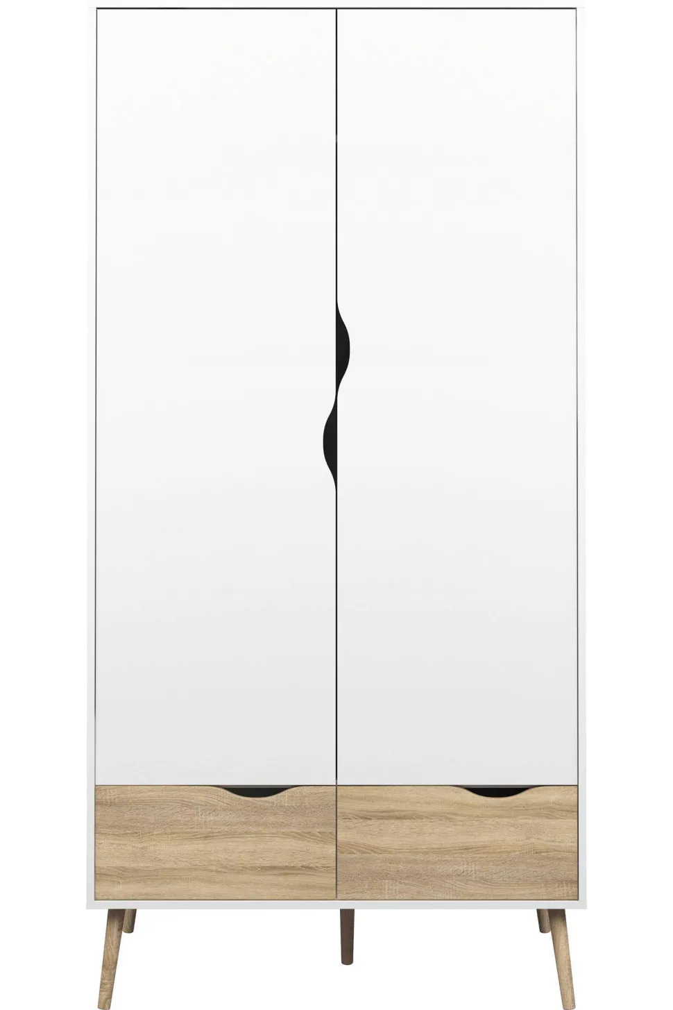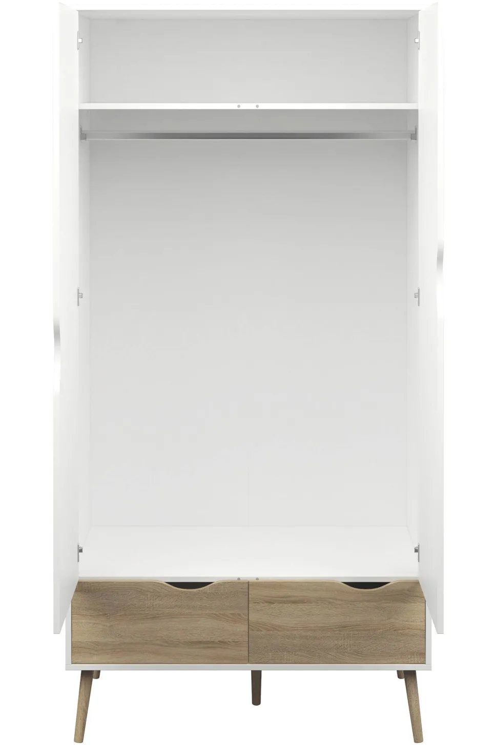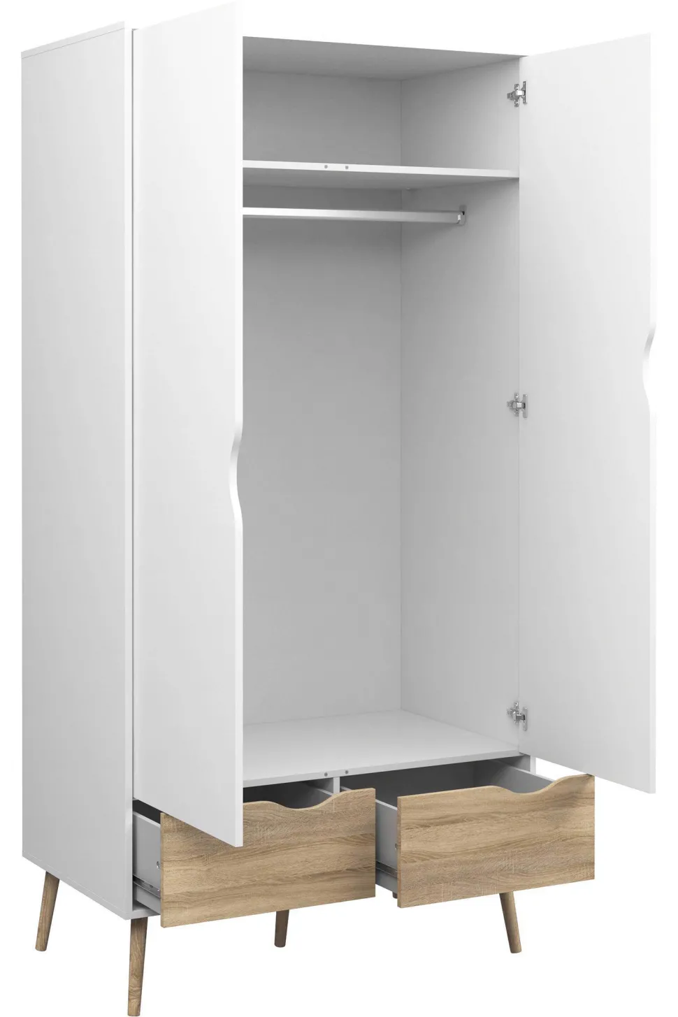 Deze 2 Deurs Kledingkast Oslo Heeft Een Mooi Scandinavisch Design. De Kast Is Gemaakt Van Spaanplaat Met Folie. Het Frame En De Deuren Hebben Een Witte Kleur. De Lades En Poten Zijn In De Kleur Eiken. De Indeling Van De Kast Bestaat Uit Een Hanggedeelte Over De Breedte Van De Kast Met Daarboven Een Legplank. Kledingkast Oslo Staat Op Poten Die Schuin Naar Buiten Geplaatst Zijn.