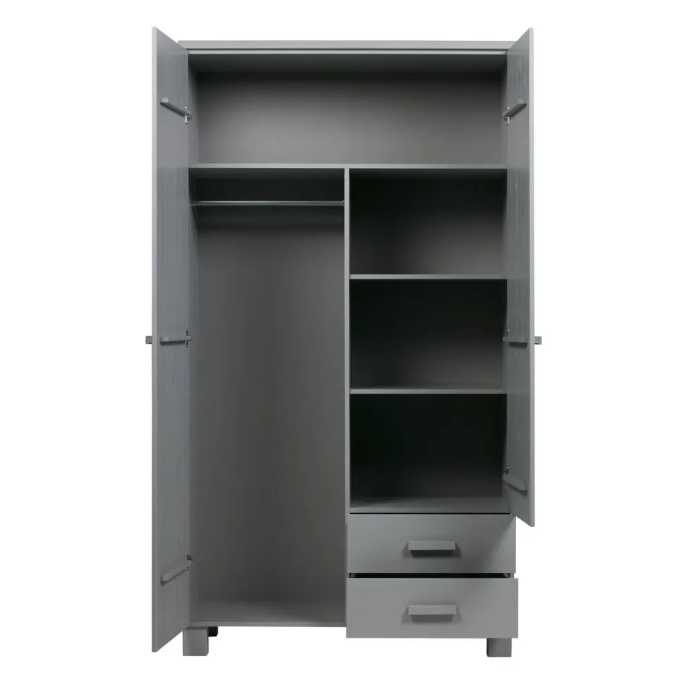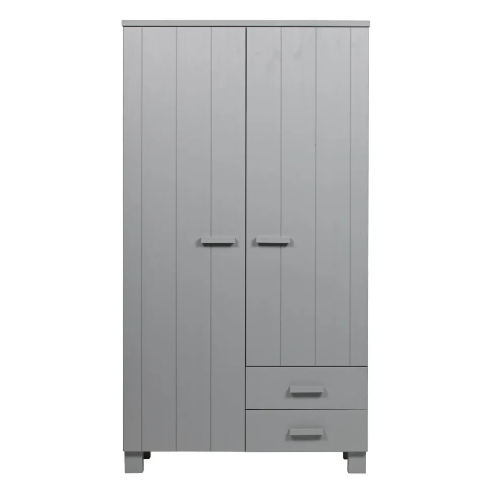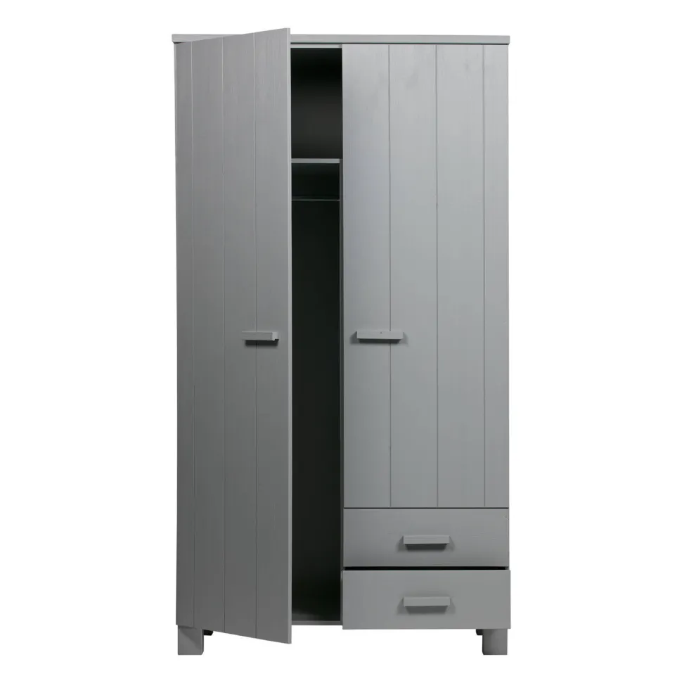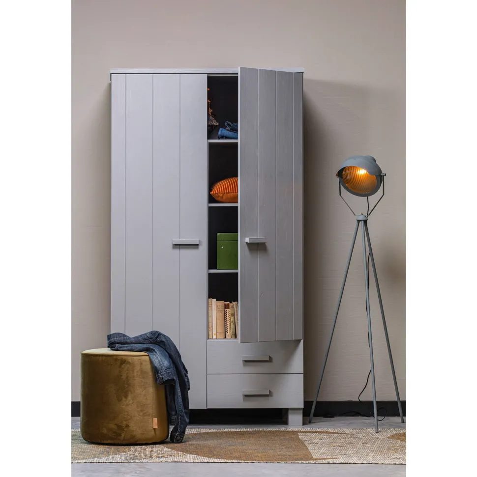 De Woood 2-Deurs Kledingkast Dennis Met 2 Laden Is Gemaakt Van Massief Grenen. De Geborstelde Afwerking En De Beton Grijs Gespoten Kleur Geven De Hang/Leg Kast Een Stoere Uitstraling. Deze Look Wordt Nog Versterkt Door De Verticale V-Groef Belijning Op De Deuren, Waardoor Deze Perfect Past In Een Stoere (Kinder) Slaapkamer. Het Interieur Van De Houten Kast Op Pootjes Is Gemaakt Van Melamine. De Kledingkast Heeft Een Legplank Over De Gehele Breedte. Het Linker Deel Van De Kledingkast Is Het Hanggedeelte. Het Leggedeelte Met Drie Smalle Legplanken En Een Ladeblok Met 2 Lades Zit Rechts. Lekker Overzichtelijk Dus En Genoeg Ruimte Om Al Je Kleren Op Te Bergen.
