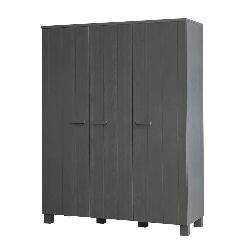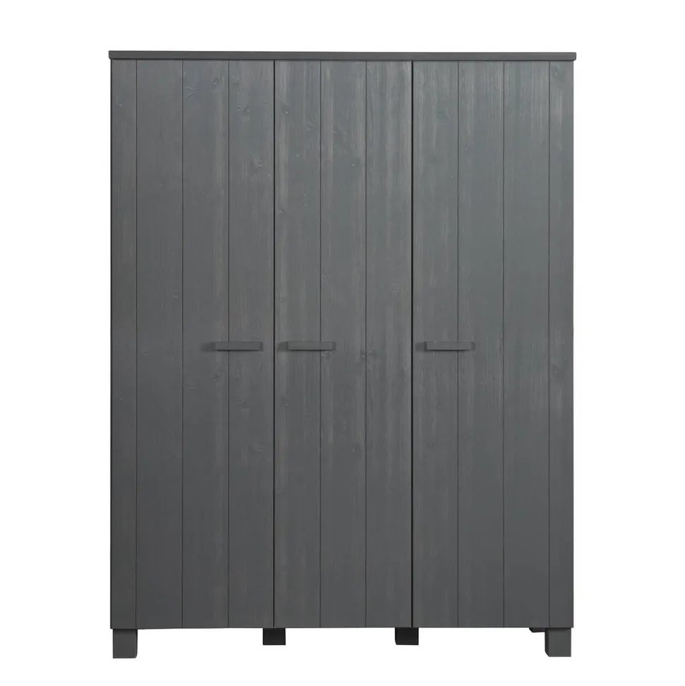 Woood Dennis Kast (H 202 X B 158 X D 55 Cm) Is Een Stoere, Praktische En Moderne Kast Uit De Collectie Van Het Nederlandse Merk Woood. De Dennis Kast Is Gemaakt Van, Fsc Gecertificeerd, Grenenhout Met Een Staal Grijze Finish En Heeft Een Geborstelde Afwerking. De Deuren Hebben Een Verticale V-Groef Belijning. Het Interieur Van De Dennis Kast Is Van Melamine En Bestaat Uit Een Brede Legplank Bovenin Met Daaronder Aan De Linker Kant Een Roede En Aan De Rechter Kant Drie Legplanken.
