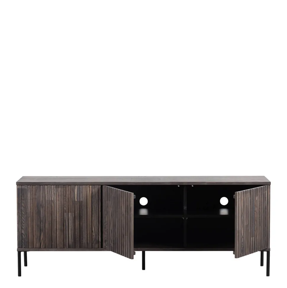 Het Gravure New Tv-Meubel Heeft Een Hoogte Van 56 Cm, Breedte Van 150 Cm En Een Diepte Van 44 Cm. De Drie Deuren Zijn Elk 37 Cm Hoog, 50 Cm Breed En 2 Cm Dik. Het Lijnenspel Op De Deurfronten Geeft De Gravure Zijn Aantrekkelijke, Herkenbare Uiterlijk. Achter De Drie Deuren Bevinden Zich Zes Afgeschermde Vakken Van 18X50X42 Cm (Hoogte X Breedte X Diepte). Het Metalen Onderstel Heeft Een Hoogte Van 15 Cm En Iedere Poot Is O 2 Cm. Achter Iedere Deur Is Een Cirkel Uitgevreesd Voor De Bedrading (O 50 Cm), Deze Is Vanaf De Grond Gemeten 40 Cm Hoog.