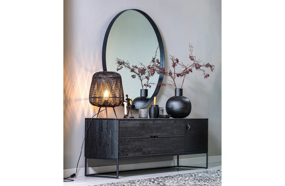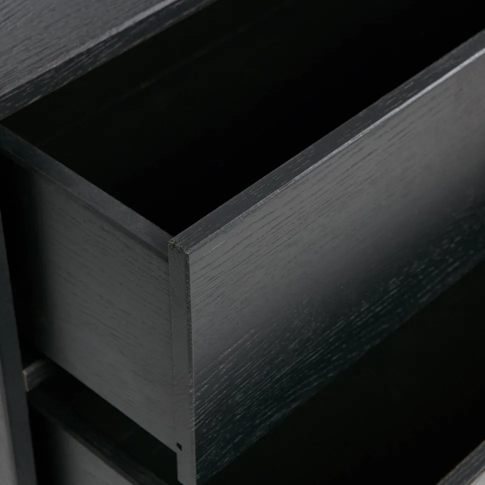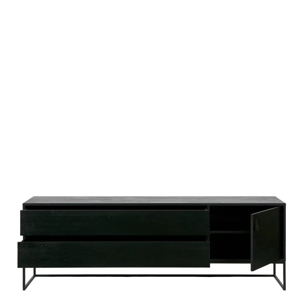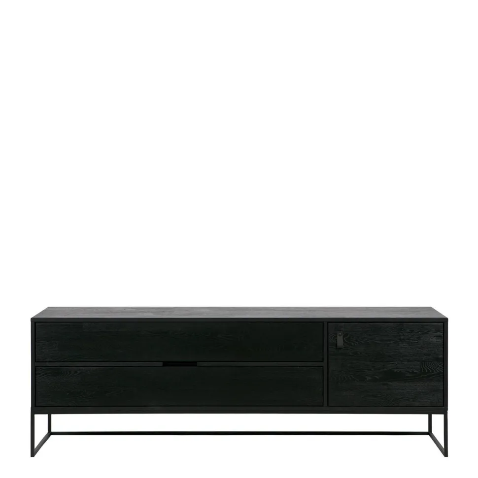 Het Silas Tv Meubel Is Een Eigen Fabricaat Van Het Nederlandse Merk Woood. Het Silas Tv Meubel Is Gemaakt Van Massief Essen (Fsc-Gecertificeerd) Met Een Geborstelde Afwerking, Dat Is Afgelakt In De Kleur Blacknight. Het Onderstel, Hoogte 20 Cm, Is Gemaakt Van Koud Gerold Staal En Is Afgewerkt In Een Zwarte Kleur. Het Silas Tv Meubel Heeft Een Hoogte Van 60,5 Cm, Een Breedte Van 180 Cm En Een Diepte Van 44 Cm. De Twee Lades Hebben Een Breedte Van 121 Cm En Een Hoogte Van 13 Cm. Het Kastje Aan De Rechterkant Heeft Een Legplank (Van Spaanplaat) En Wordt Afgesloten Met Een Deur, Hxb 37X50,1 Cm Met Leertje. De Afmetingen Van Dit Gedeelte Zijn Hxb 41X50 Cm. Het Tv Meubel Is Voorzien Van Een Gat Voor Het Wegwerken Van Kabels.